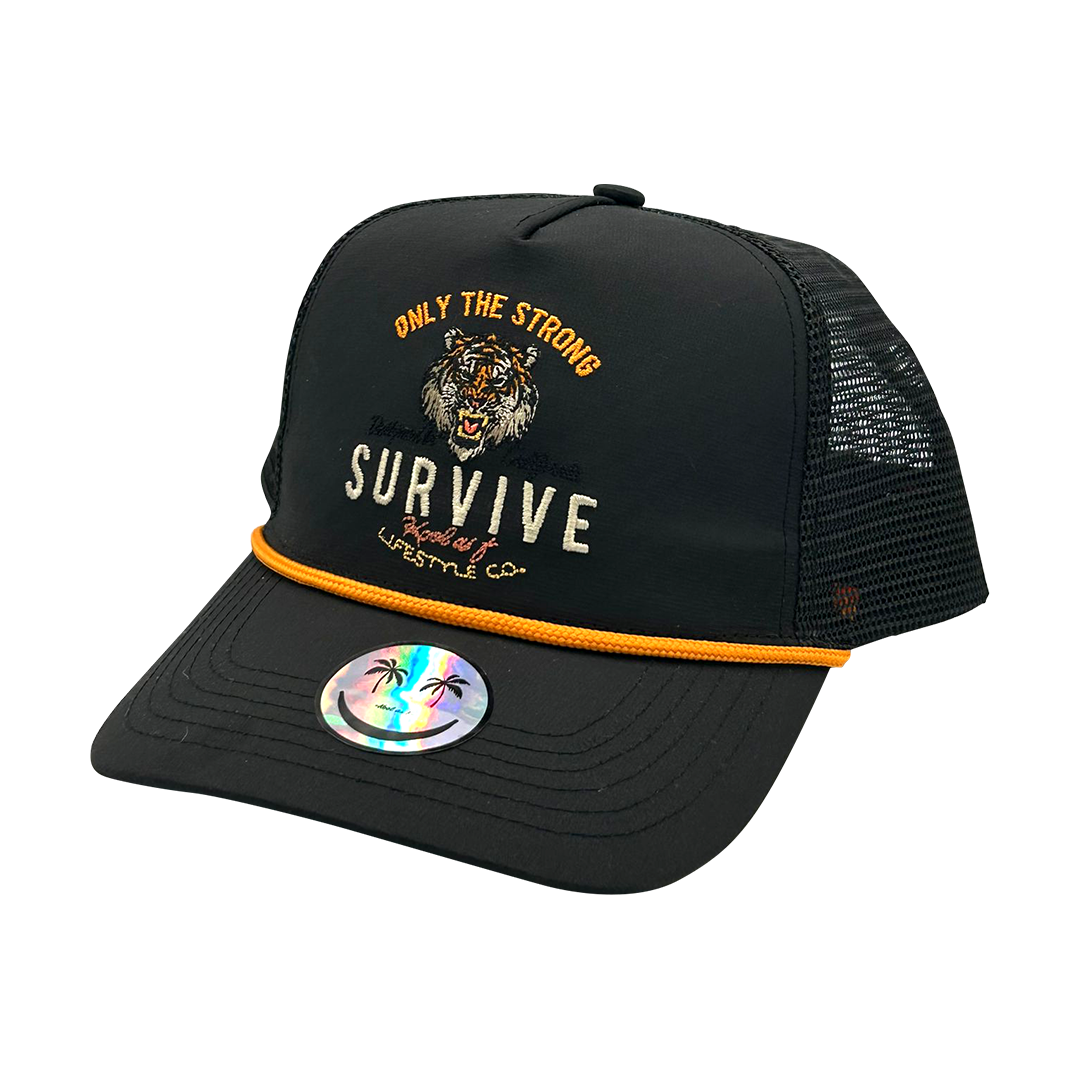 Embrace resilience with the Only The Strong Survive Trucker Hat. This black cap features bold embroidery of a fierce tiger and the empowering phrase "Only The Strong Survive." The orange rope detail adds a vibrant touch, while the mesh back ensures breathability. Perfect for those who embody strength and determination. Ideal for making a bold statement.