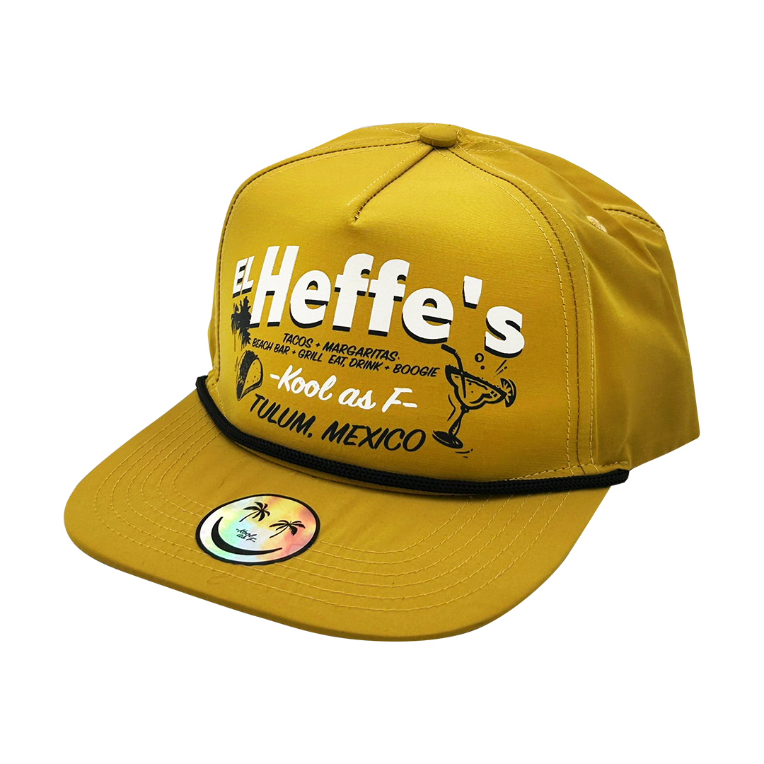 Spice up your style with the El Heffe Hat. This vibrant yellow cap features bold white and black embroidery with "El Heffe's" and playful cocktail graphics. The black rope detail adds a distinctive touch, making it perfect for those who love a fun and festive vibe. Ideal for beach days and casual outings in Tulum, Mexico.