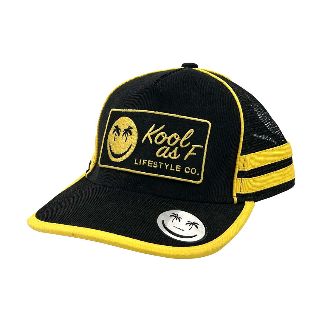 Stand out with the Kool as F Lifestyle Trucker Hat. This bold cap features a black and yellow design with embroidered branding and a smiley face with palm trees. The mesh back ensures breathability, while the yellow rope detail adds a unique touch. Perfect for making a statement while staying cool and comfortable.