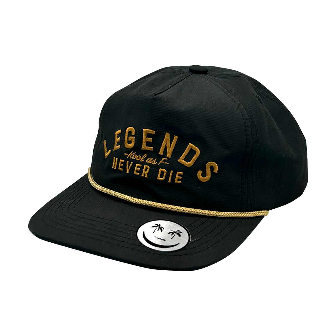 Celebrate timeless style with the Legends Never Die Hat. This black cap features bold gold embroidery with the phrase "Legends Never Die" and "Kool as F" text. The gold rope detail adds a classic touch, making it a perfect accessory for those who appreciate enduring fashion.