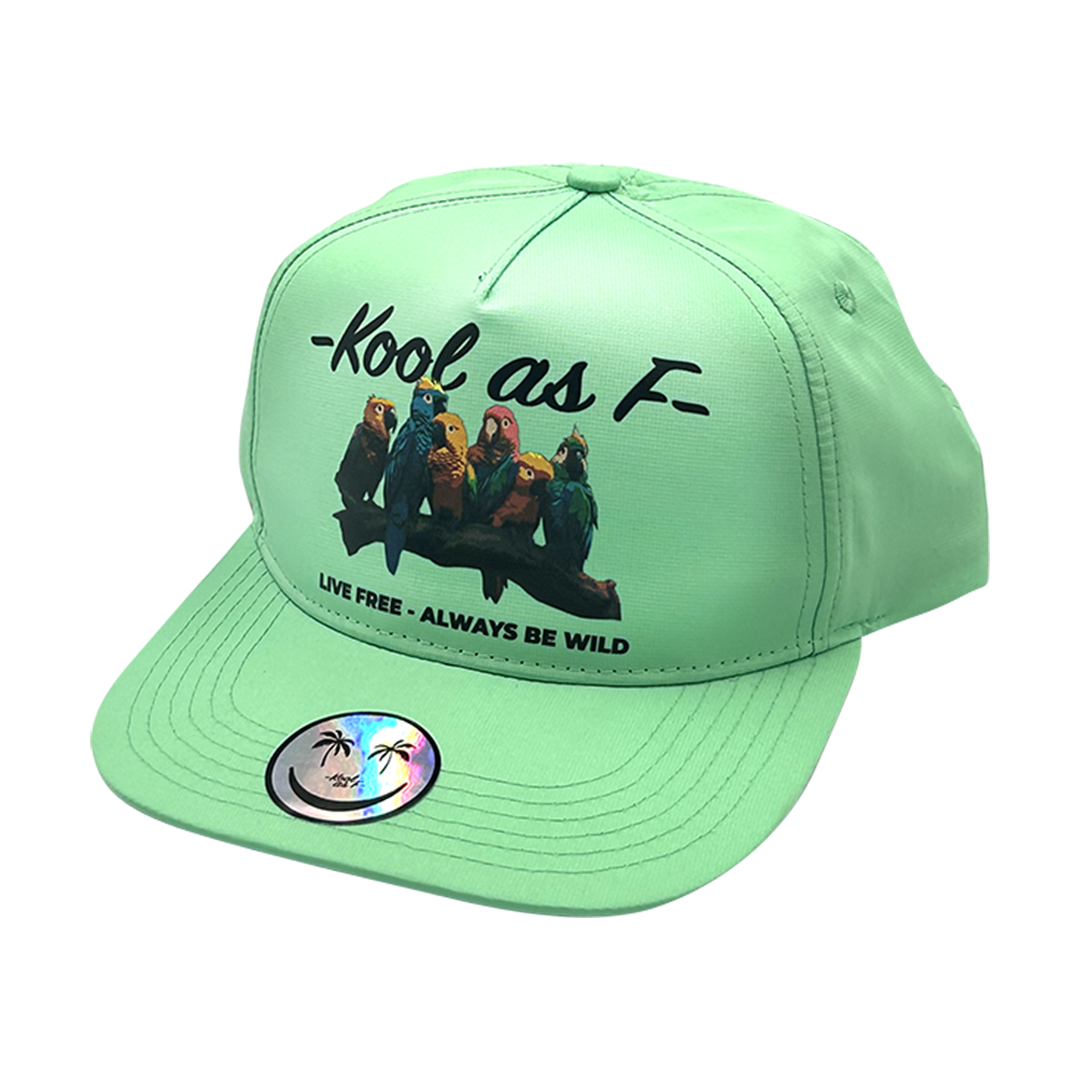 Brighten your style with the Parrots Hat. This mint green cap features a colorful embroidery of parrots perched on a branch, along with "Kool as F" text. Designed in the City of Angels, it includes a black rope detail for added flair. Perfect for those who love a vibrant and playful look. Ideal for sunny days and casual outings.