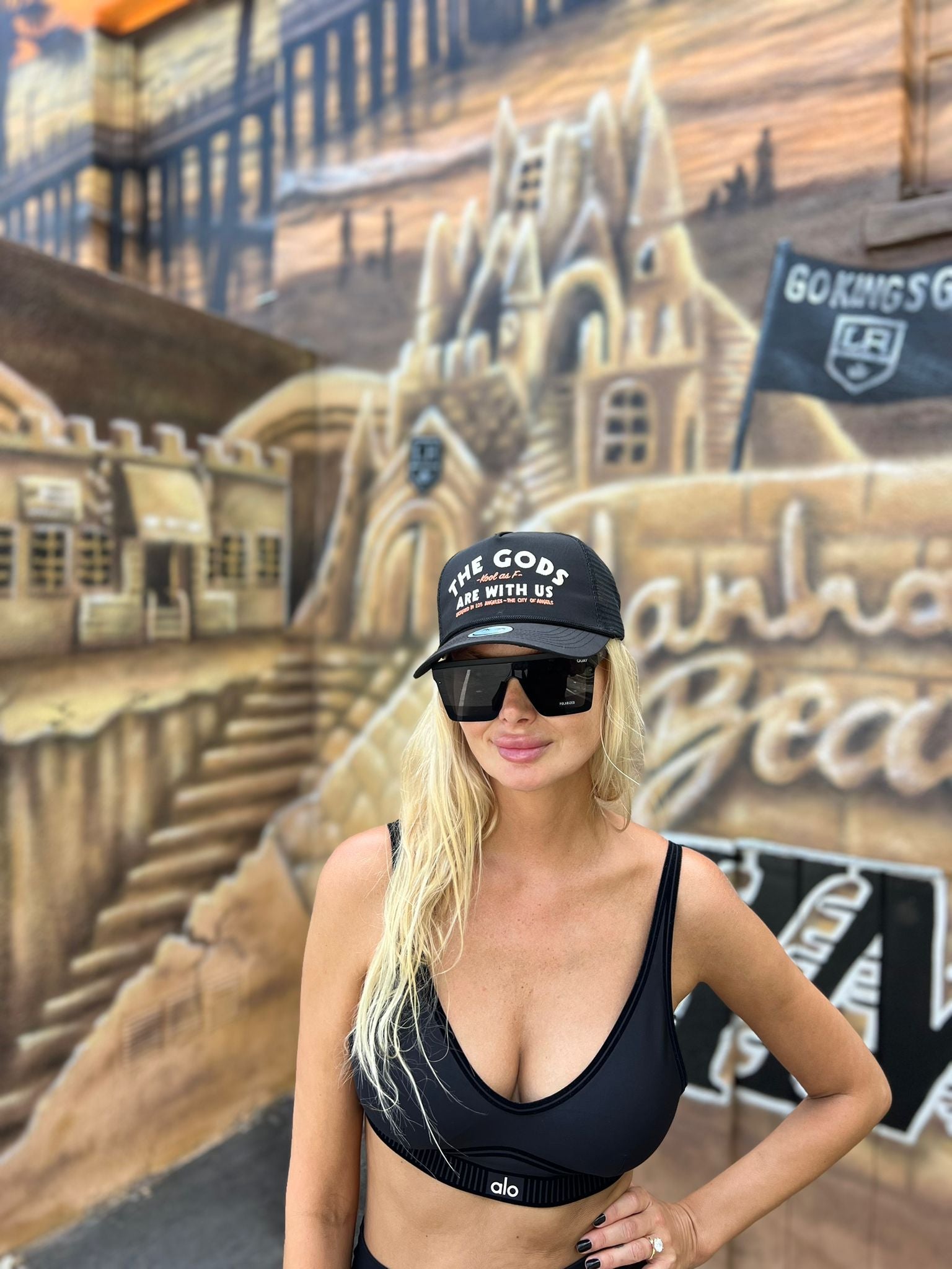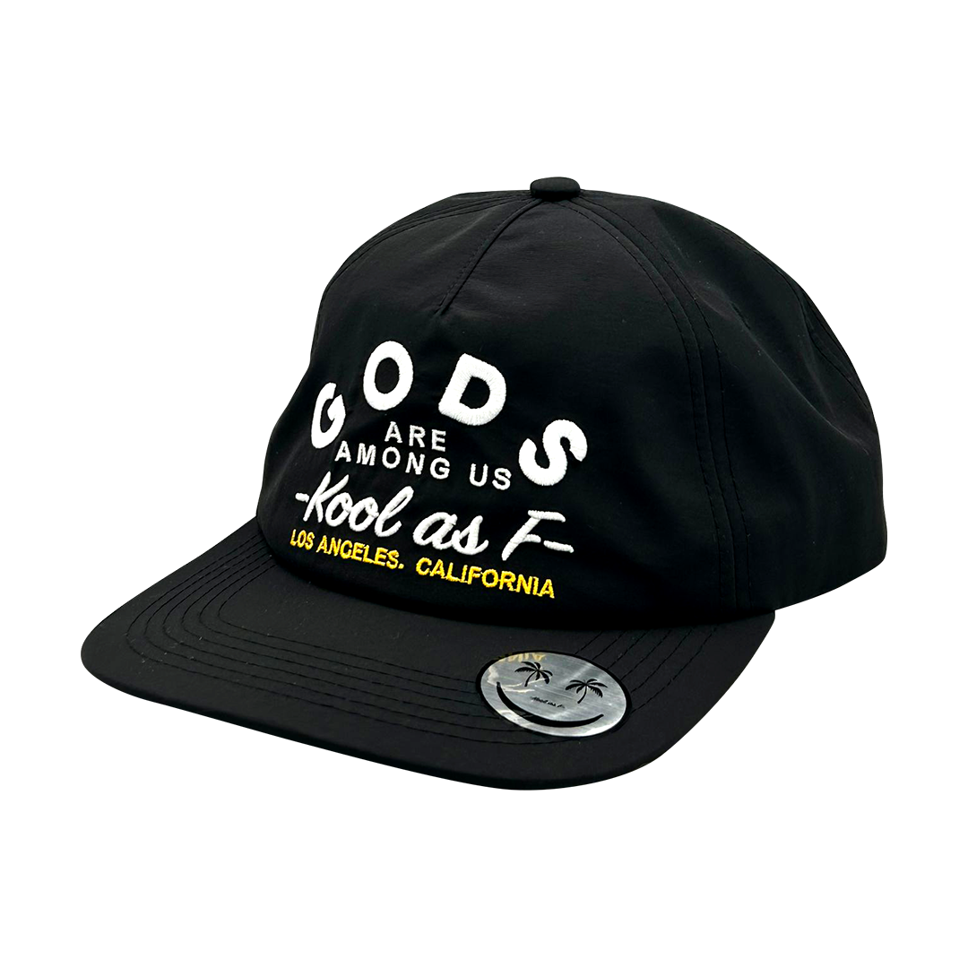 Embrace the divine with the Gods Are Among Us Hat. This sleek black cap features bold white embroidery with the phrase "Gods Are Among Us" and "Kool as F" text. The yellow "Los Angeles, California" accent adds a vibrant touch, making it a standout accessory for those who appreciate a celestial vibe. Perfect for casual wear and making a statemen