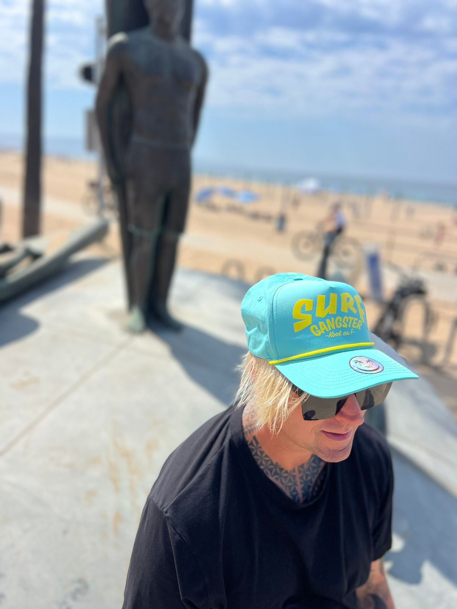 Make waves with the Surf Gangster Hat. This mint green cap features bold yellow "Surf Gangster" text and "Kool as F" branding. The yellow rope detail adds a playful touch, capturing the adventurous spirit of beach life. Perfect for those who love to surf and enjoy a laid-back style.