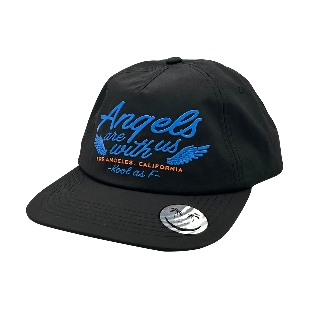 Embrace a heavenly vibe with the Angels Are With Us Hat. This black cap features striking blue embroidery with the phrase "Angels are with us," accented by wing designs. The orange "Los Angeles, California" text adds a pop of color, making it a stylish accessory for any outfit. Perfect for those who love a touch of celestial charm.