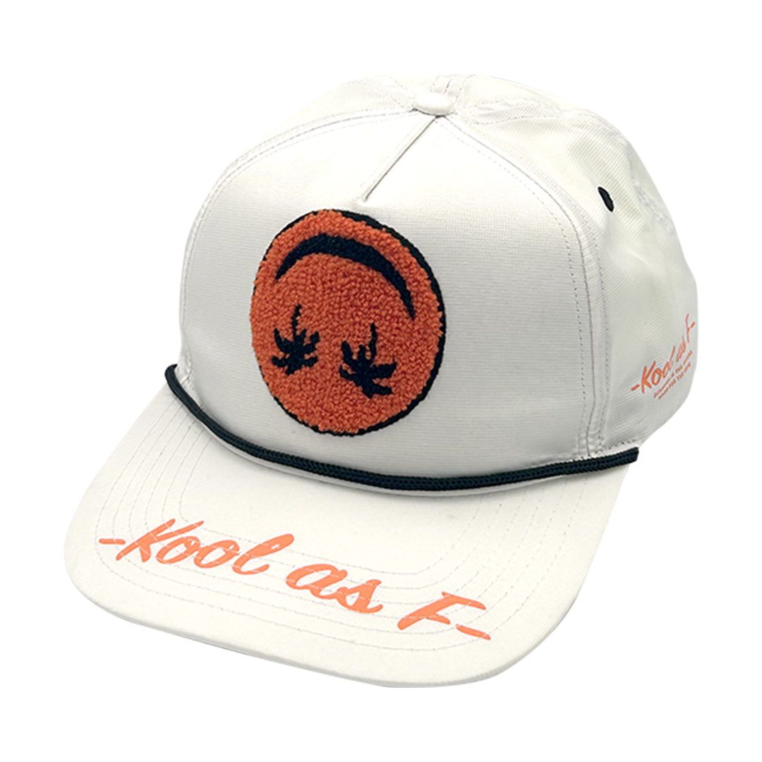 Embrace playful style with the Kool As F Carpet Happy Face Snapback Hat. This white cap features a bold orange textured smiley face design, accented by palm trees for a tropical twist. The "Kool as F" text in vibrant orange on the brim and side adds a signature touch, while the black rope detail above the brim completes the look. Perfect for those who love to stand out with a fun and unique accessory.
