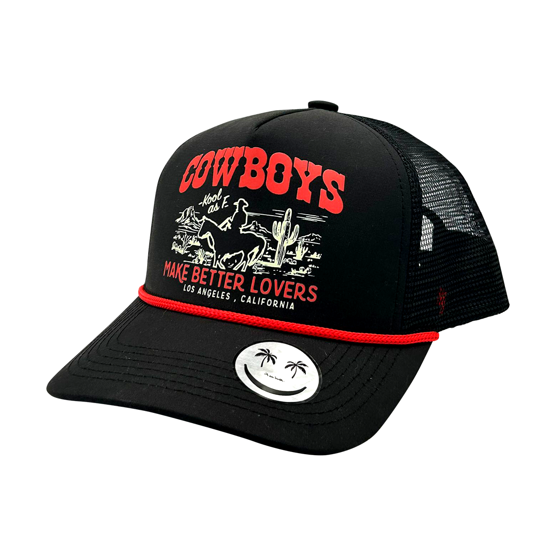 Make a bold statement with the Cowboys Make Better Lovers Trucker Hat. This black cap features vibrant red and white embroidery with a cowboy scene and playful text. The mesh back ensures breathability, while the red rope detail adds a unique touch. Perfect for those who love a mix of Western charm and modern style.